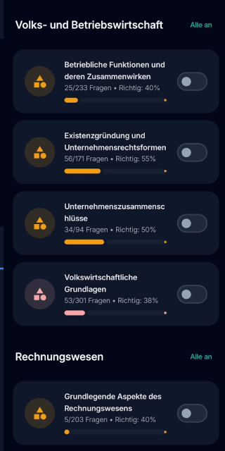Jede Frage ist einem konkreten Themenbereich zugeordnet. So erkennt unser Algorithmus, in welchen Bereichen du Stärken hast – und wo Lücken schlummern. Keine Frage ist zufällig.